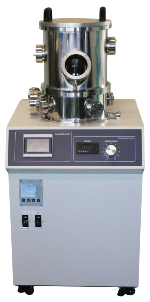 商品は、装置本体にターボポンプとロータリーポンプが内蔵された、据え置き型真空蒸着装置です。
